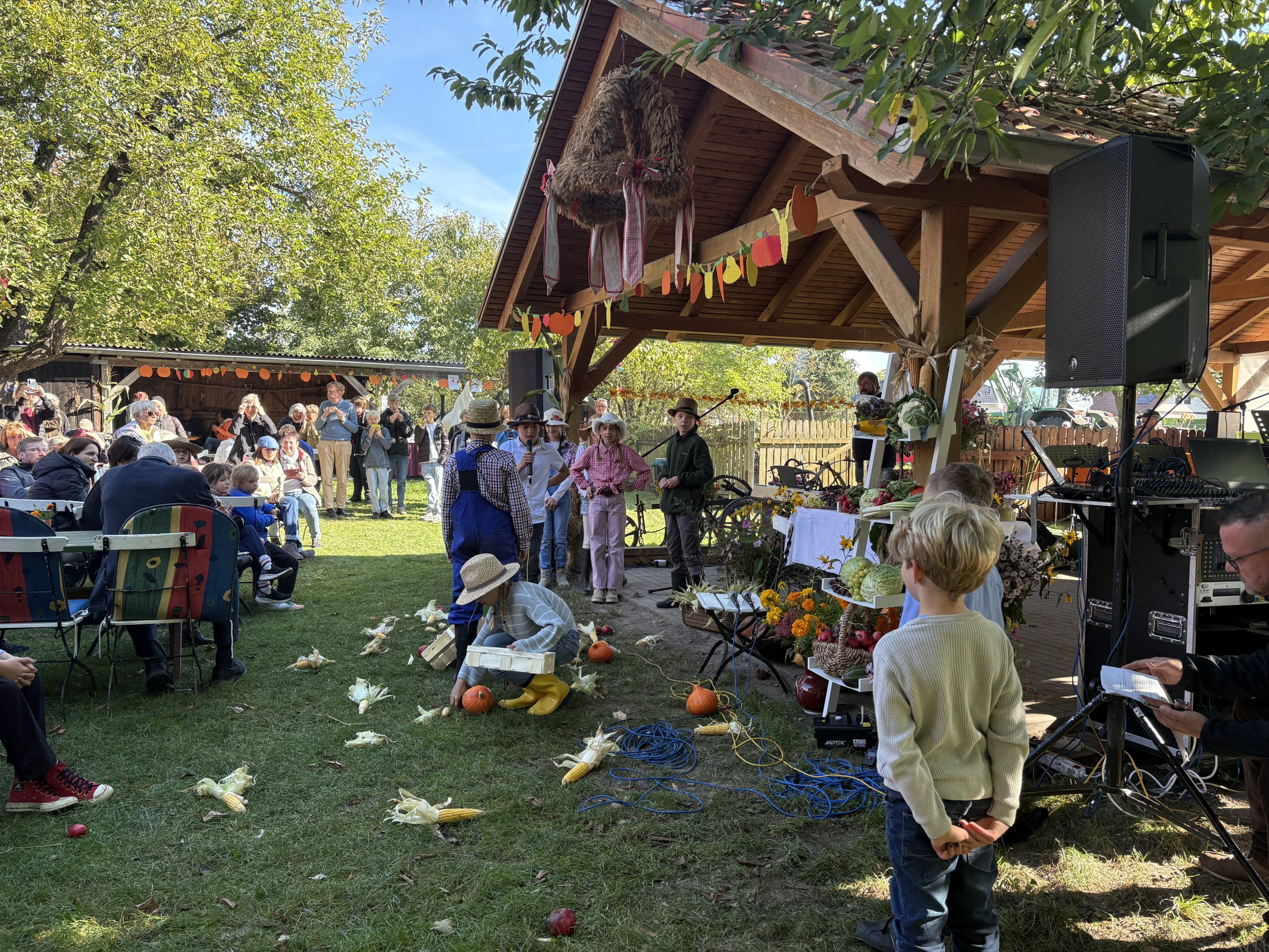 Unser diesjähriges Herbstprojekt stand wieder im Zeichen des Bastelns. Die Dekoration für das Erntedankfest gestalten unsere Schülerinnen und Schüler schon seit vielen Jahren und auch am 28.09.2025 ist Bauer Bohms Hof wieder im herbstlichen Farbenglanz erstrahlt. Als weiteres Highlight boten einige unserer Kinder den Besuchern in diesem Jahr ein dynamisches Theaterstück, in dem sich Mensch und Tier darauf einigten, dass die Früchte der Arbeit von allen gemeinsam geerntet werden und die Natur für jedes etwas Wertvolles und Nützliches bereithält.